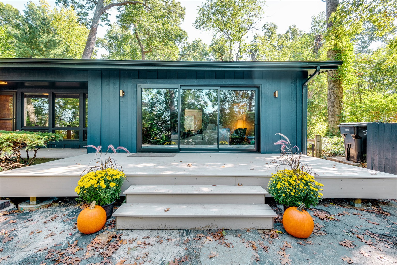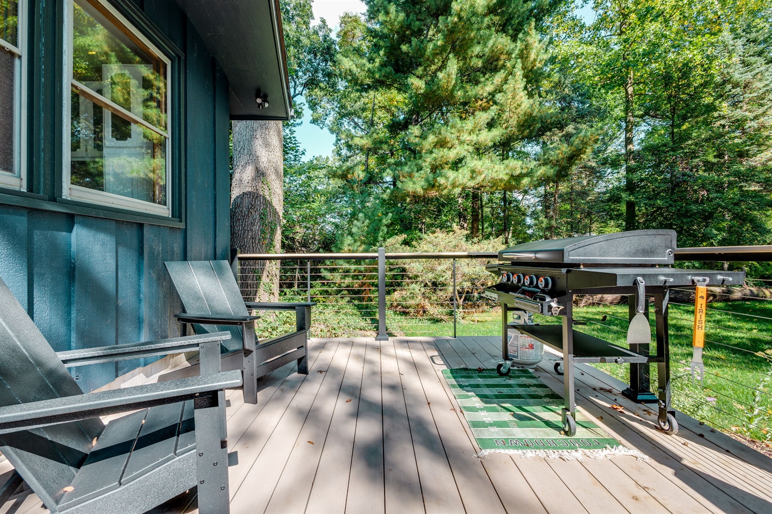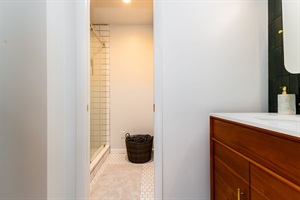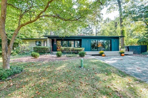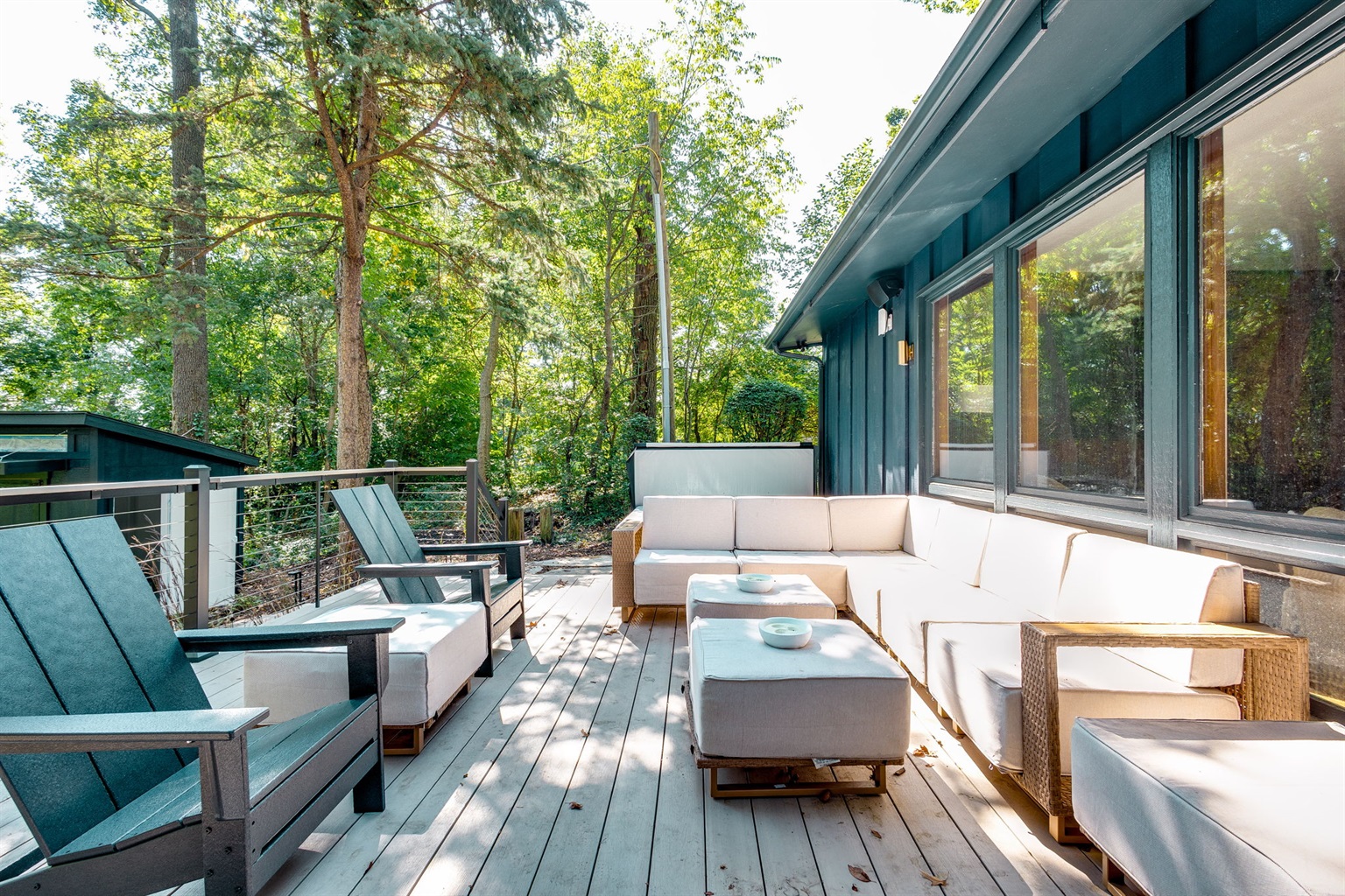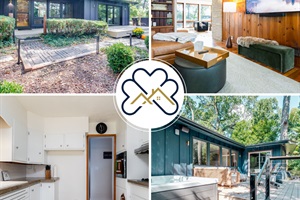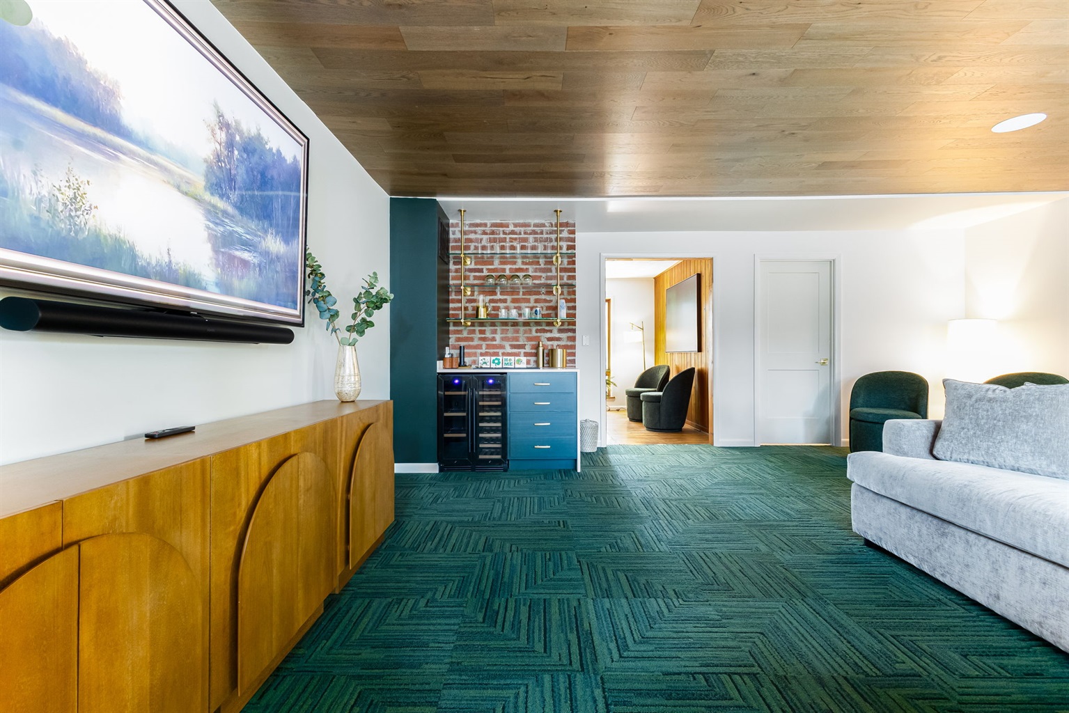 Inside, you’ll find three bedrooms: a master suite with a king bed, a cozy guest room with a queen bed, and a third bedroom featuring a daybed. The home’s layout offers plenty of space to relax, starting with the main living room at the entrance and a comfortable sitting room just off to the side. A converted garage has been transformed into a second living room with a large TV, dry bar, and a full bathroom—perfect for lounging or game day celebrations. Both the living room near the entrance and the recreation room feature a pullout couch.