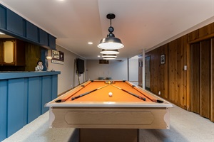 The fully finished basement provides even more fun, featuring a billiards table and two built-in twin beds, making it a great spot for both recreation and extra sleeping space.