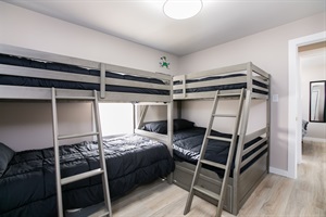 The home boasts two well-appointed bedrooms, each offering plush bedding and storage space. The master bedroom features a queen-sized bed and an en-suite bathroom for added privacy and convenience. The second bedroom features 2 sets of bunk beds with 3 twin beds and one double, ensuring a comfortable stay for all guests. The full bathroom is stocked with fresh towels to ensure a comfortable stay.