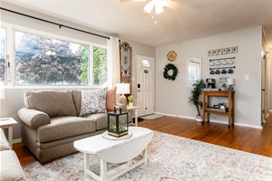 The bright and airy living room features a comfortable couch and loveseat. Large