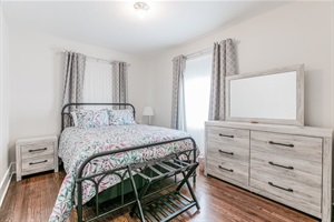 There is one bedroom that has a queen bed and the other bedroom has a trundle single bed. Each bedroom is equipped with dressers and a closet. The bedrooms are outfitted with comfortable beds and fresh linens to ensure a restful night's sleep.