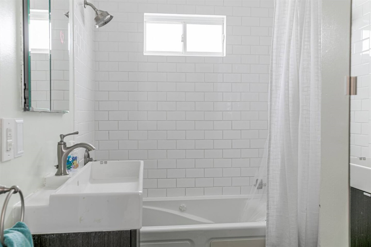 The bathroom has all the essentials, including a shower/tub combo, fresh towels, and complimentary toiletries.